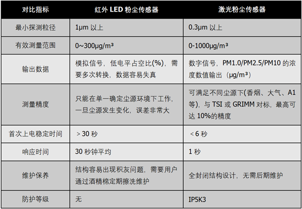 LED紅外粉塵傳感器與激光型粉塵傳感器的性能對(duì)比: