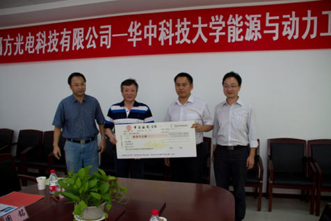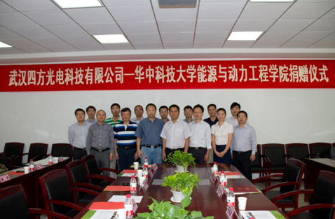 2012年9月29日上午,四方光電股份有限公司向華中科技大學(xué)能源與動力工程學(xué)院捐贈儀式在在學(xué)院動力樓二樓會議室舉行。公司向能源與動力工程學(xué)院捐贈100萬元,用于學(xué)院學(xué)生獎學(xué)金、教師獎教金。公司總經(jīng)理熊友輝、副總經(jīng)理蔣泰毅,華中科技大學(xué)能源學(xué)院院長黃樹紅、黨總支書記陳剛出席了儀式。儀式由能源學(xué)院副院長姚洪主持。