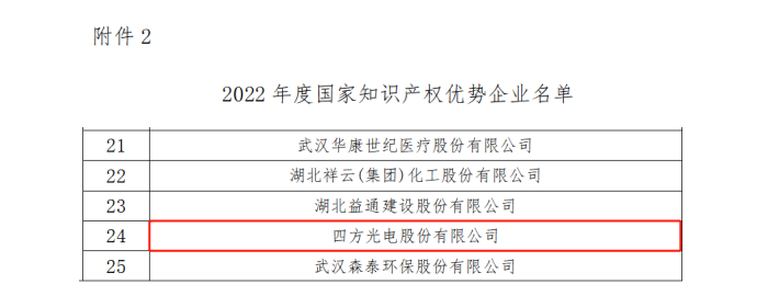 四方光電榮獲“國(guó)家知識(shí)產(chǎn)權(quán)優(yōu)勢(shì)企業(yè)”稱號(hào)