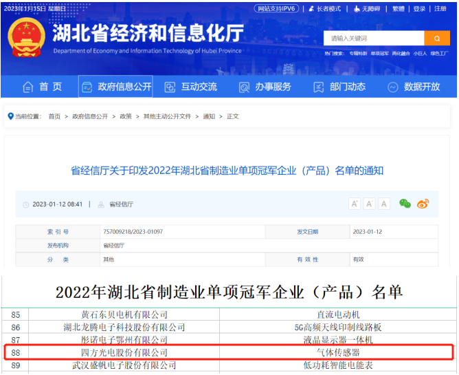 1月12日,湖北省經濟和信息化廳發(fā)布《關于印發(fā)2022年湖北省制造業(yè)單項冠軍企業(yè)(產品)名單的通知》,四方光電獲評“2022年湖北省制造業(yè)單項冠軍企業(yè)”。