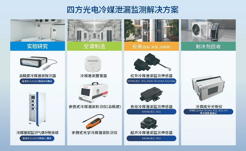 在技術(shù)創(chuàng)新方面,四方光電始終堅(jiān)持多元化發(fā)展,橫向拓展了熱導(dǎo)和超聲技術(shù)路線,進(jìn)一步豐富了冷媒泄漏監(jiān)測傳感器的產(chǎn)品線,以滿足不同客戶的多樣化需求。并且基于綜合的傳感器技術(shù)平臺,四方光電縱向開發(fā)了包括冷媒實(shí)驗(yàn)室研究設(shè)備(符合UL/IEC附錄LL和附錄MM測試要求)、空調(diào)/冷媒產(chǎn)線環(huán)境冷媒泄漏檢測儀、空調(diào)配套的冷媒泄漏監(jiān)測傳感器和制冷劑回收的一整套完整冷媒泄漏監(jiān)測解決方案。目前已經(jīng)可以覆蓋R454B、R454C、R1234YF、R1234ZE、R290、CO2、NH3等多種冷媒的檢測,服務(wù)范圍從家用/商用制冷設(shè)備延伸至工業(yè)制冷、冷鏈物流等新領(lǐng)域。
