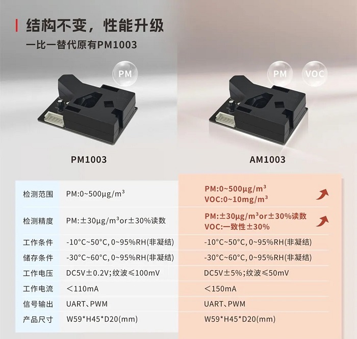 基于現(xiàn)有的PM1003 產(chǎn)品方案,可以“零改動”切換到AM1003??蛻艏饶芸焖傺a齊VOC檢測功能,又能降低升級風(fēng)險和時間成本,加速產(chǎn)品迭代。