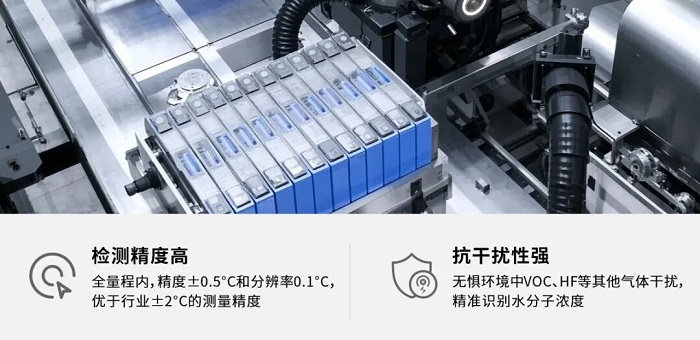 在鋰電池車間中,露點(diǎn)傳感器需同時(shí)滿足精度高和強(qiáng)抗干擾的核心要求:不僅要在-70℃~-30℃的露點(diǎn)下保證測量準(zhǔn)確,還要有效抵抗VOC、HF等干擾氣體的影響。